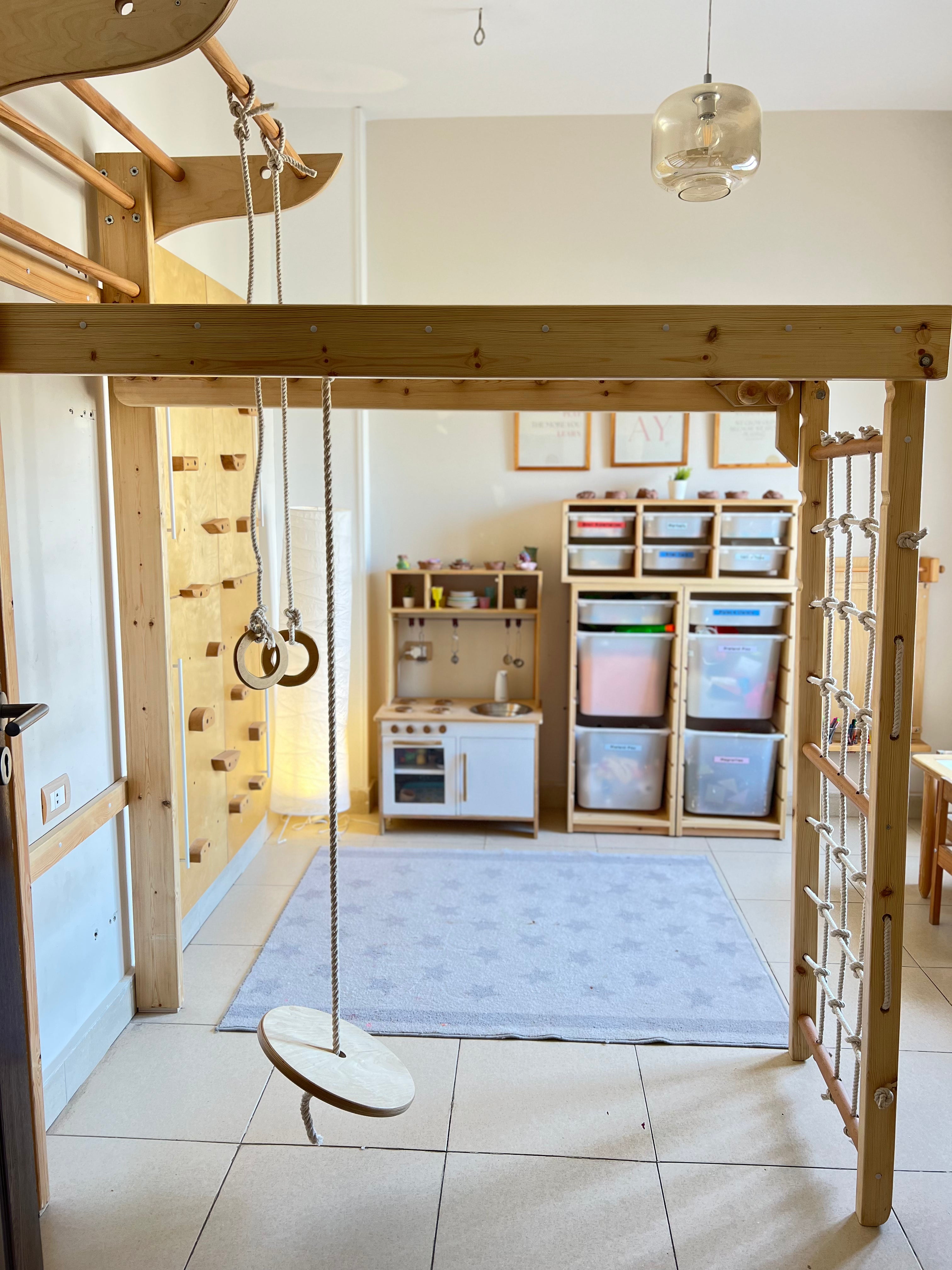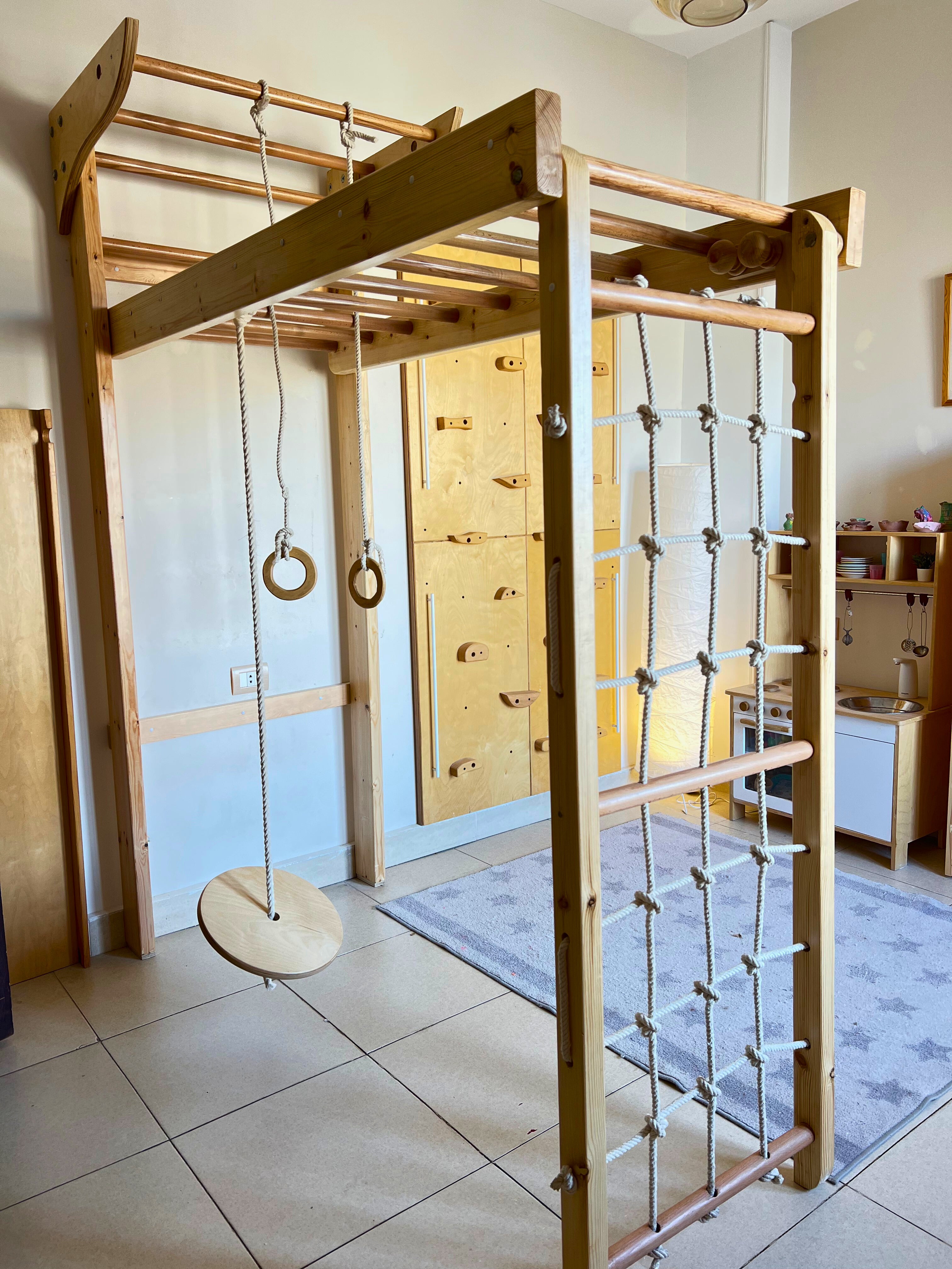 The Foldable Swedish Ladder & Gym is a multifunctional indoor play structure designed to encourage active movement, strength development, and imaginative play. Perfect for home use, it features monkey bars, climbing rods, rope-climbing, a swing plate, and monkey rings, offering endless opportunities for fun and exercise. The gym is easily foldable to save space and comes with a built-in safety lock to ensure it remains securely open during use, preventing accidental closure. No tools are required to open and close the gym, making it hassle-free for parents to set up and store.