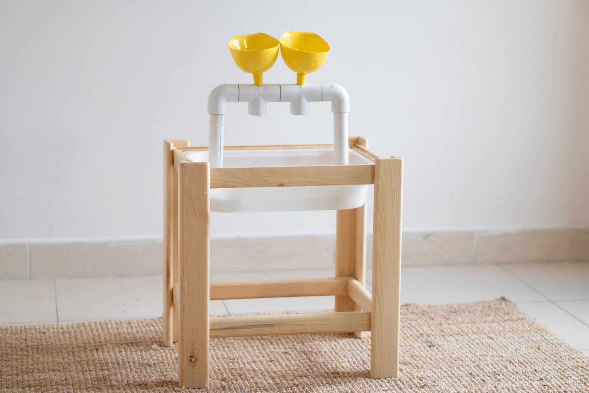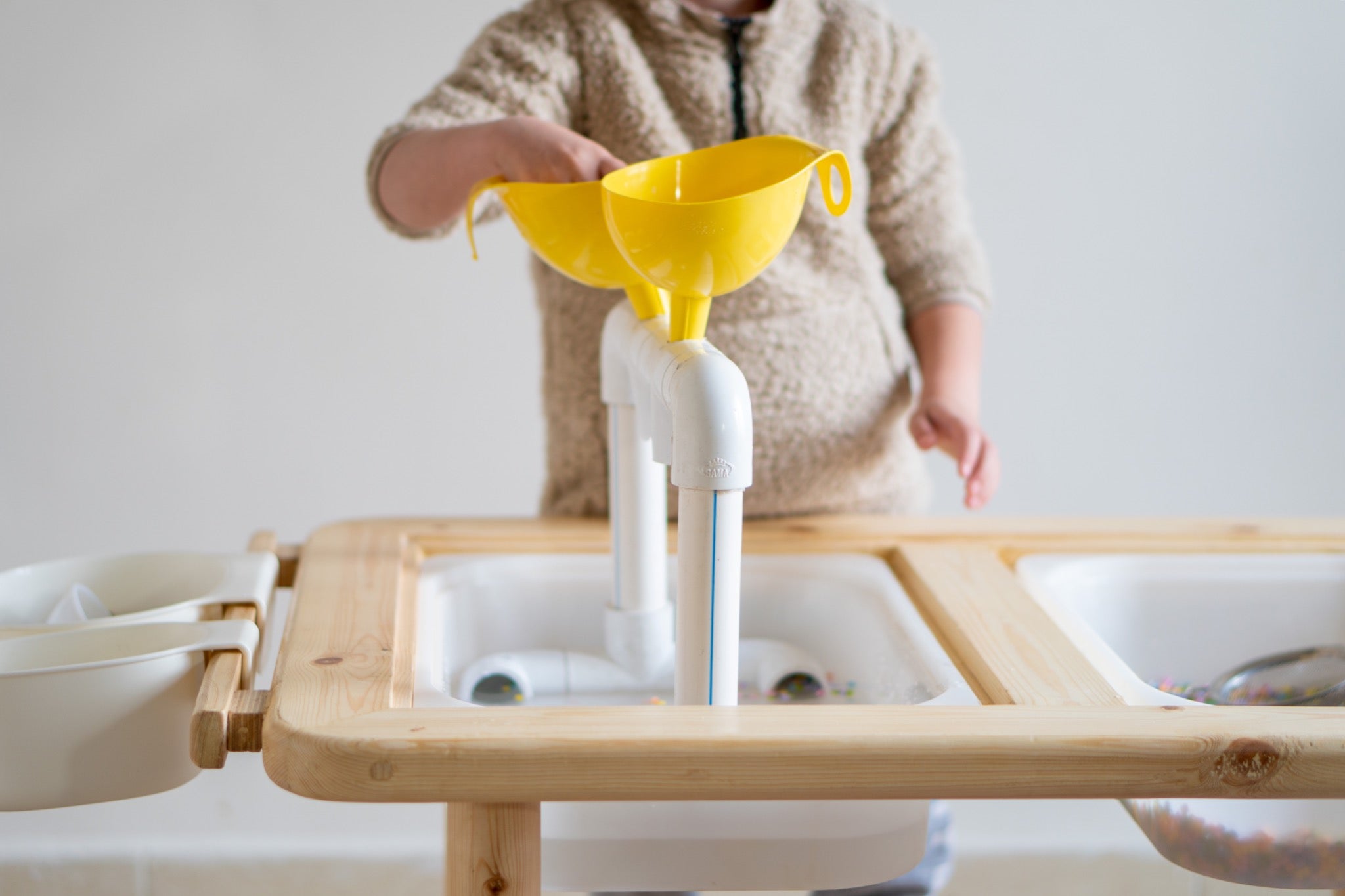 Our pipes & funnels add-on can be used with or without a sensory table, and fits into the Ikea bin. It is a great tool for children to practice pouring and scooping and learn about cause and effect, i.e "What's going to happen when I pour sand into the funnels?". It also helps with their problem-solving skills as children realize that not every item will fit into the funnels.