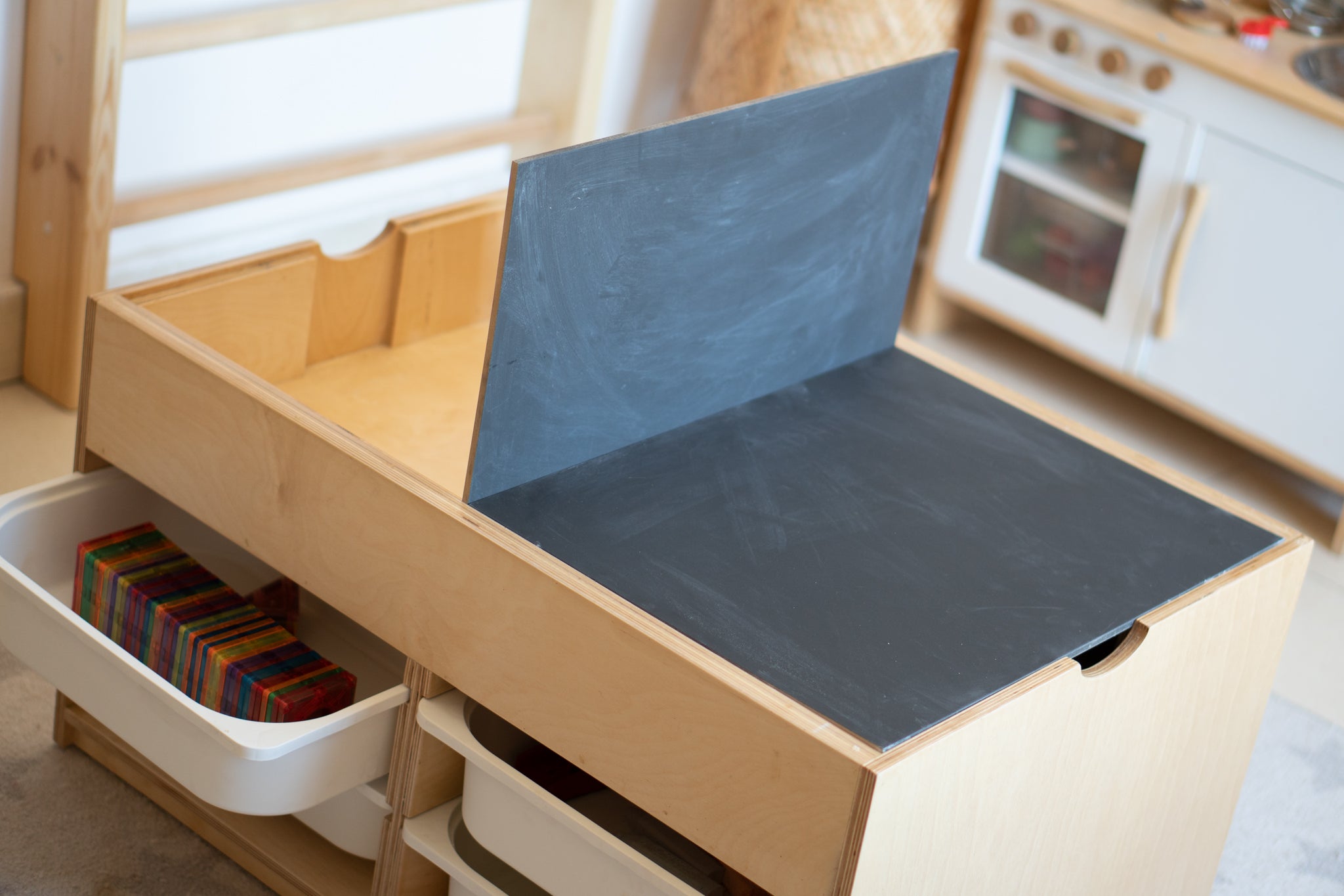 Comes with double-sided boards—chalkboard on one side, whiteboard on the other. They can be placed horizontally or vertically, giving kids the flexibility to draw, write, or paint in whichever position they prefer.