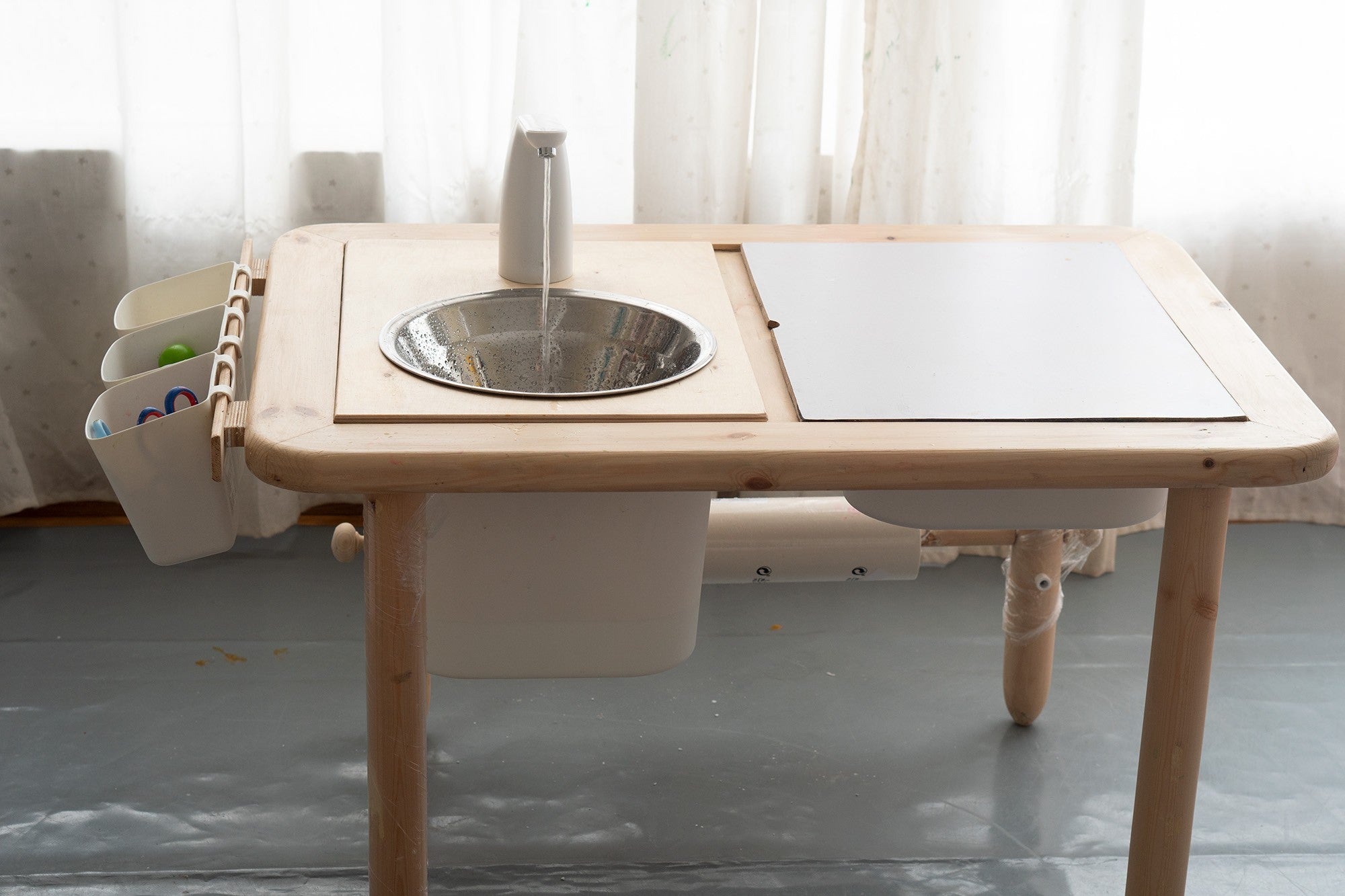 An add-on for all sensroy table models, our water-station is made for children who love playing with water, this add-on is a great tool to practice hand-washing or simply have fun with the water! It comes with an electric water-pump installed (that is rechargeable) that works by clicking on the top button.